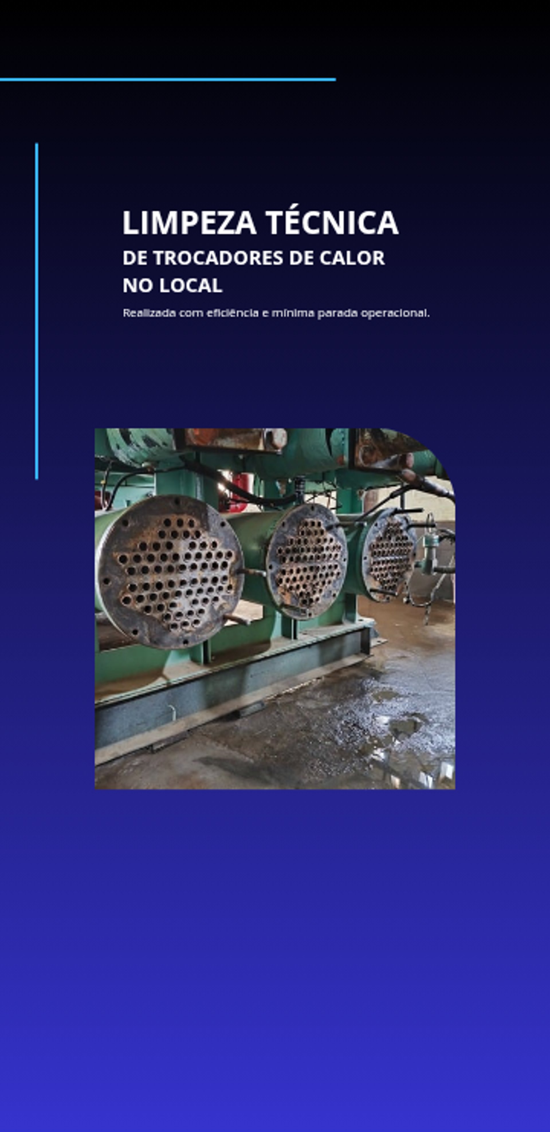 Nossos serviços abrangem manutenção preventiva e corretiva, incluindo limpeza, lavagem, re-expansão de tubos, retubagem, substituição de componentes e inspeções técnicas.Essas intervenções são essenciais para prolongar a vida útil do equipamento, aumentar a eficiência energética, evitar falhas, reduzir paradas de produção e prevenir contaminação entre fluidos